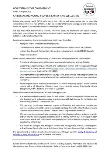 Ballarat Community Health (BCH) understands that children and young people can be especially vulnerable and may face risks of harm. At BCH we consider children and young people to be someone under the age of 18, in accordance with Victorian legislation.