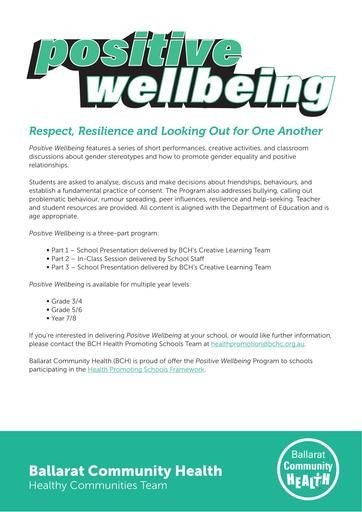 Respect, Resilience and Looking Out for One Another. Positive Wellbeing features a series of short performances, creative activities, and classroom discussions about gender stereotypes and how to promote gender equality and positive relationships.